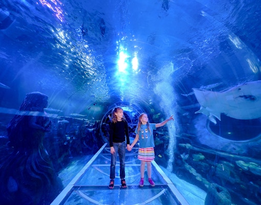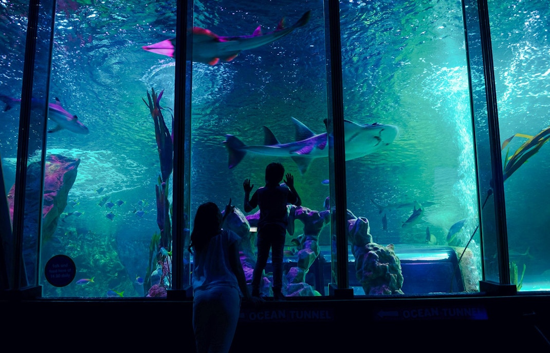 Gehen Sie durch einen Glastunnel, umgeben von Meeresbewohnern, die über Ihnen und um Sie herum schwimmen.