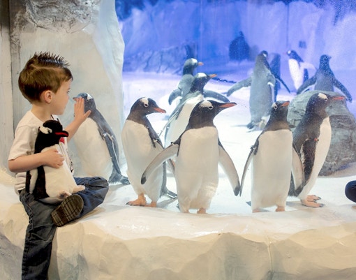 Beobachten Sie verspielte Pinguine in einem Lebensraum, der einer eisigen Umgebung nachempfunden ist.