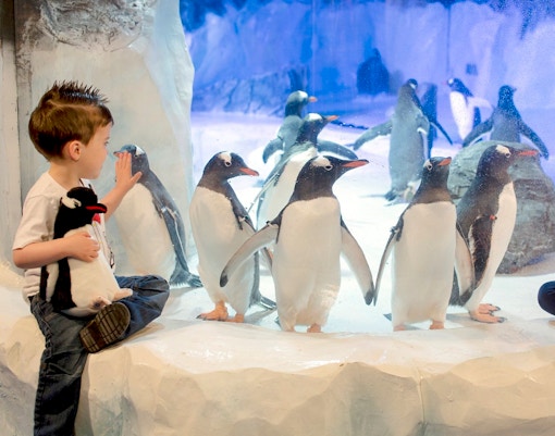 Beobachten Sie verspielte Pinguine in einem Lebensraum, der einer eisigen Umgebung nachempfunden ist.
