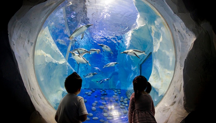 Follow the designated route through immersive areas including a tropical reef display and the Penguin Ice Adventure. In the Antarctic scene, observe Gentoo penguins gliding beneath icy rocks. The one-way path ensures a structured tour of each distinct zone.